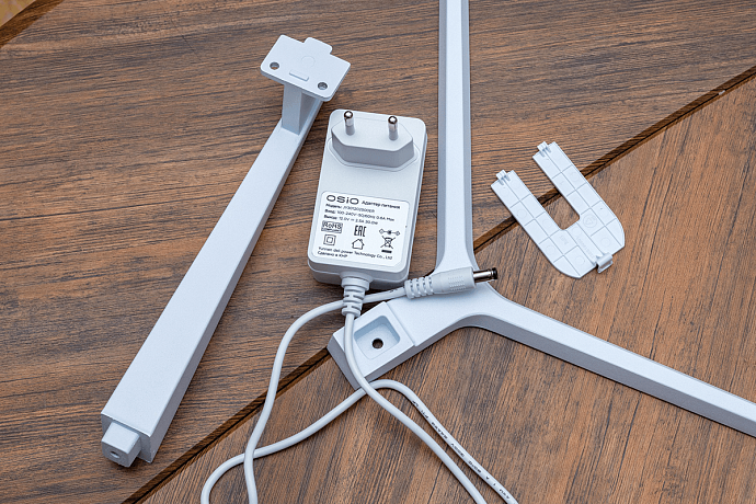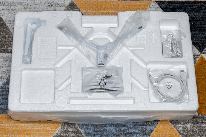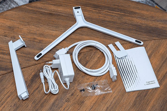 Комплектация состоит из совмещённого с кабелем адаптера питания мощностью 30 Вт (12 В, 2,5 А) общей длиною 1,6 метра (разъём DC толщиной ~5,45 мм), а также из HDMI-кабеля длиною 1,5 метра, руководства пользователя и состоящей из несколько частей подставки (основание, стойка, 4 винта и декоративная крышка). Кабель HDMI судя по надписи High Speed и по результатам тестов точно не ниже версии 1.4, чего вполне достаточно для получения у героя обзора максимальной частоты обновления при разрешении Full HD.