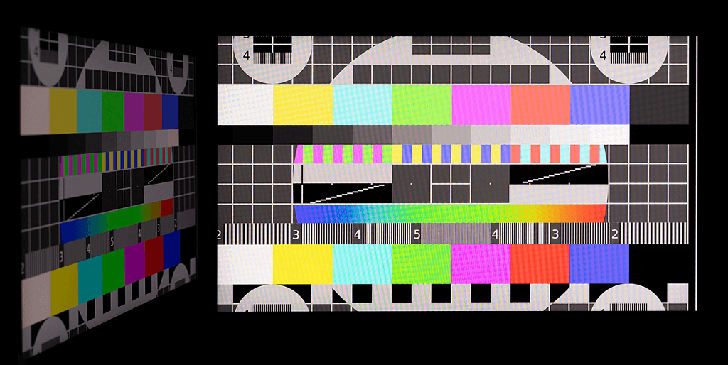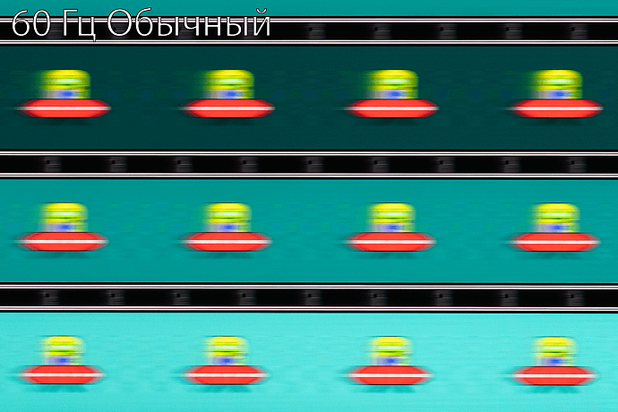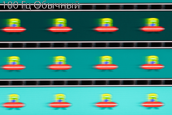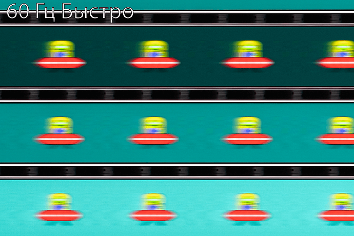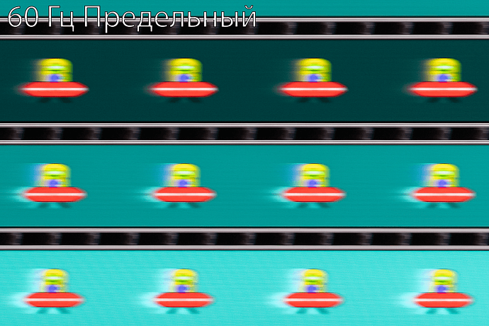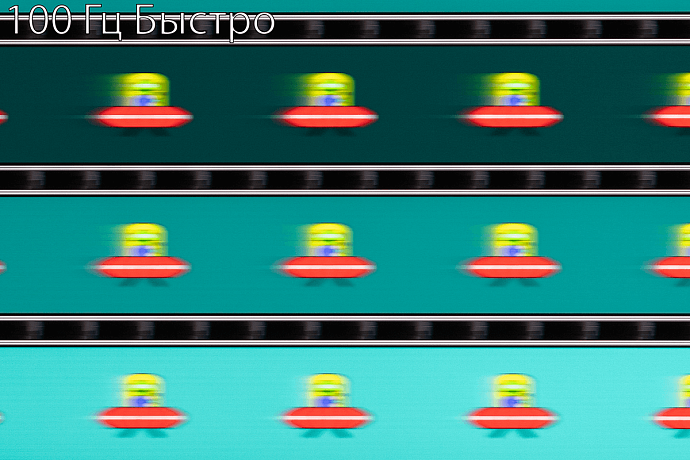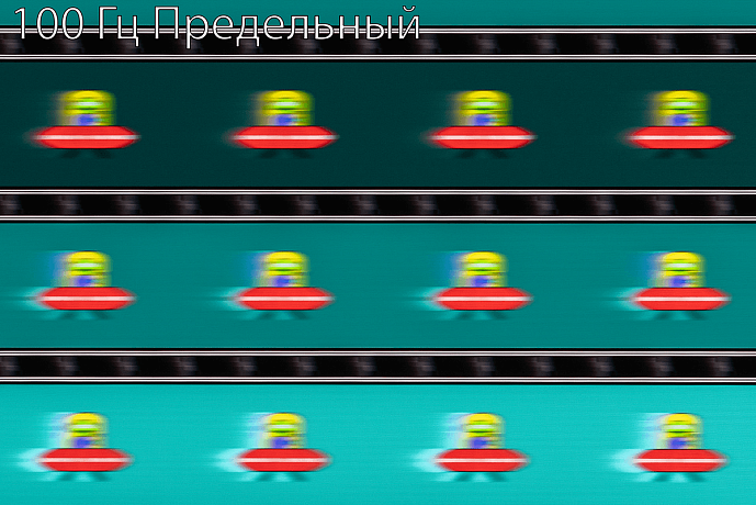 С помощью UFO Test можно визуально оценить скорость матрицы и возникающие при разгоне артефакты. Фотографии были сделаны в движении с помощью слайдера, с выдержкой 1/15 секунды и скоростью движения в самом тесте 960 пиксель/с для частоты обновления 60 Гц или 1200 пиксель/с для частоты 100 Гц. При значении времени отклика «Предельный» нетрудно заметить бело-синие дубликаты движущихся объектов.
