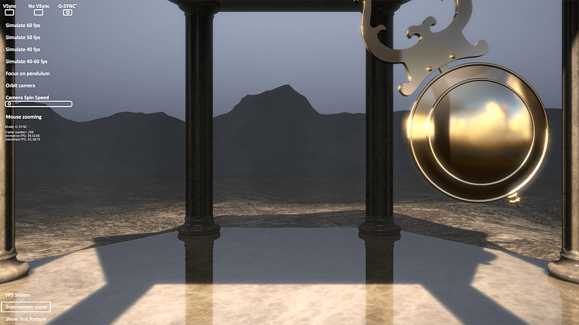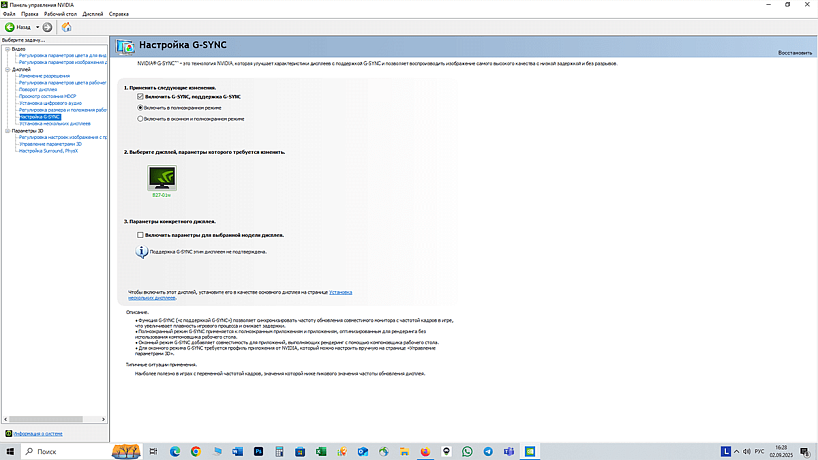 Судя по описанию в магазине ДНС поддерживается технология AMD FreeSync (хотя в других источниках такой информации не наблюдаю), а также выявлена поддержка G-SYNC Compatible при использовании видеокарты GeForce RTX 3060 (официально не заявлено). В меню монитора нужно включить функцию AdaptiveSync, но работать технология будет только при подключении монитора через DisplayPort. В тесте G-Sync Pendulum Demo изображение достаточно плавное и без видимых мной разрывов.