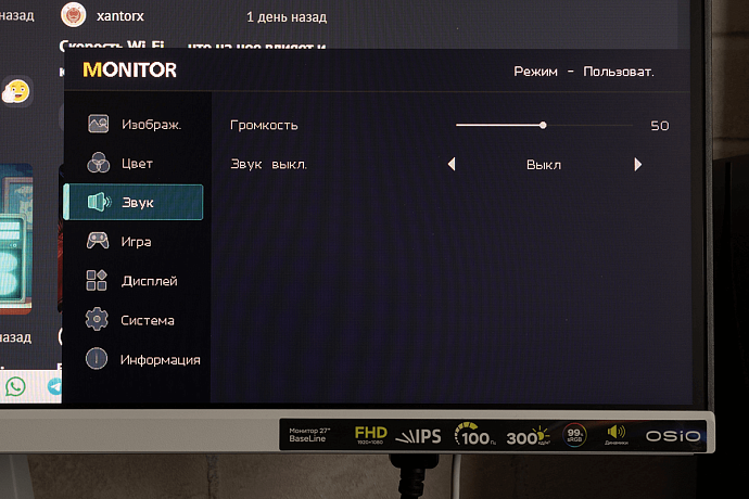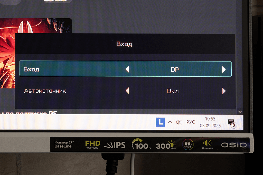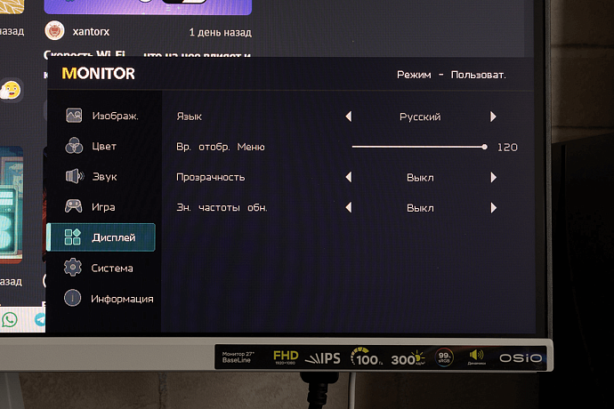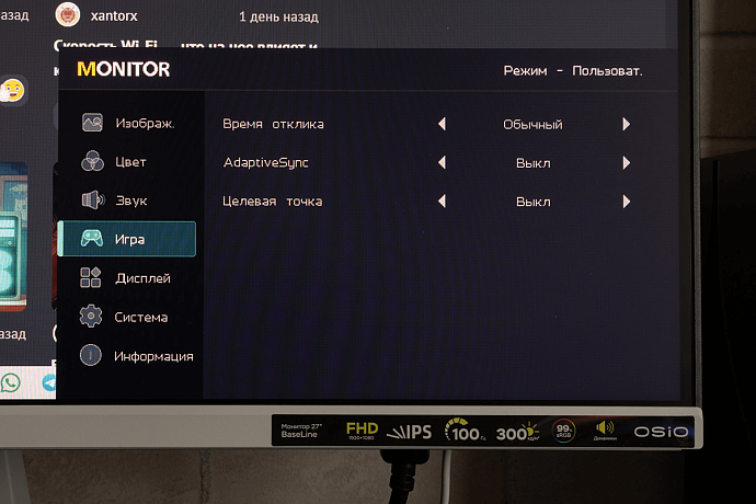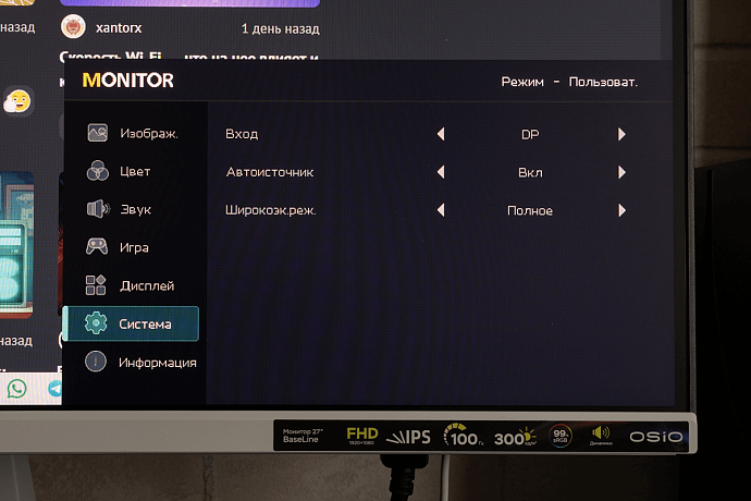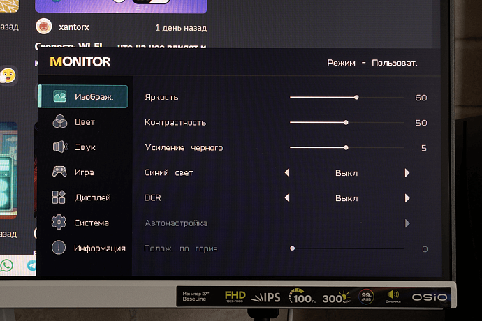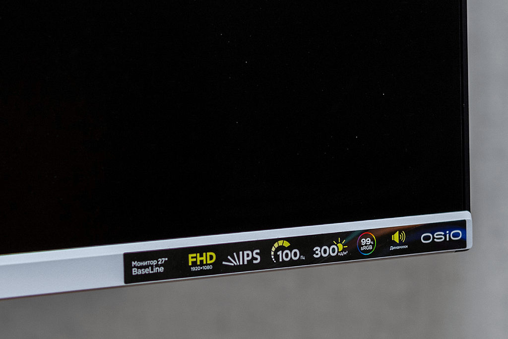 OSIO BaseLine B27-01w получил IPS-экран диагональю 27 дюймов с разрешением 1920 x 1080 пикселей (соотношение сторон 16:9), и как показывают отзывы, такое сочетание подходит не всем пользователям. Кому-то будут заметны отдельные пиксели, но многое зависит от остроты зрения и расстоянии до монитора. Лично я не вижу большой разницы при сравнении с 24-дюймовыми мониторами, тоже обладающими разрешением Full HD.
