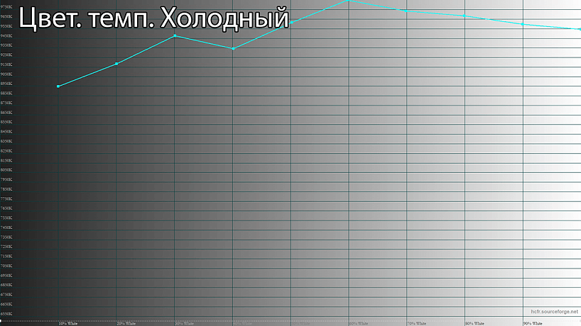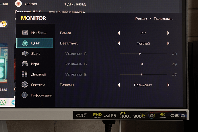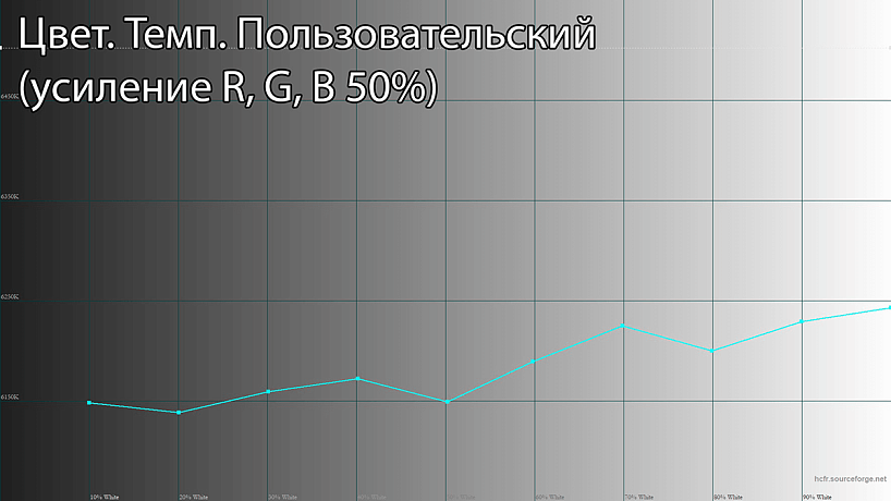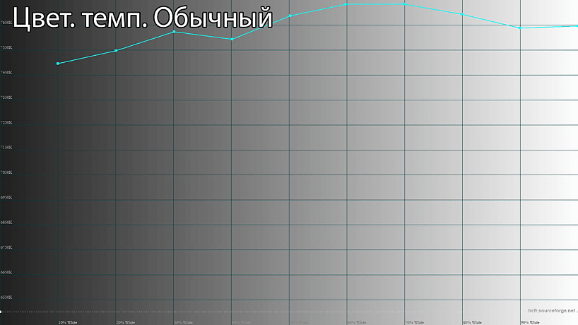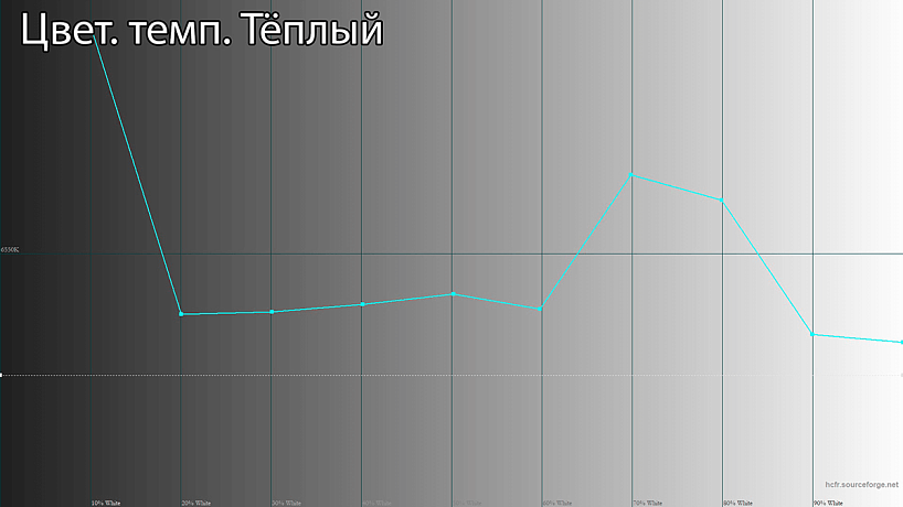 Для изменения цветовой температуры есть 3 заготовленных профиля и пользовательский режим с ручной регулировкой 3 ползунков (R, B и G). Вполне можно остановиться на профиле «Тёплый» с весьма близкой к оптимальной цветовой температуре 6500K.