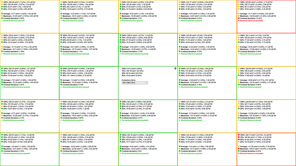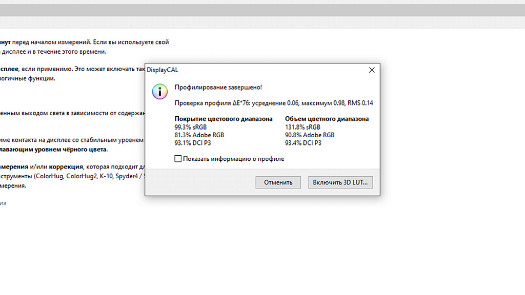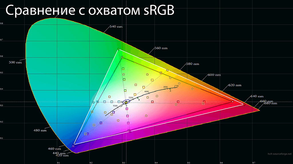 Тестирование дало понять, что обеспечивается покрытие 99,3% цветового охвата sRGB (производителем и заявлено 99%) при объёме 131,8%, и покрытие 93,1% охвата DCI-P3.