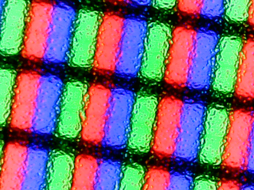 Структура субпикселей судя по фотографии с цифрового микроскопа типичная для матриц IPS, хотя чёткое изображение получить невозможно – всё из-за полуматовой поверхности экрана, с которой значительно уменьшается количество бликов по сравнению с глянцевым вариантом. При этом и явного кристаллического эффекта не наблюдается.