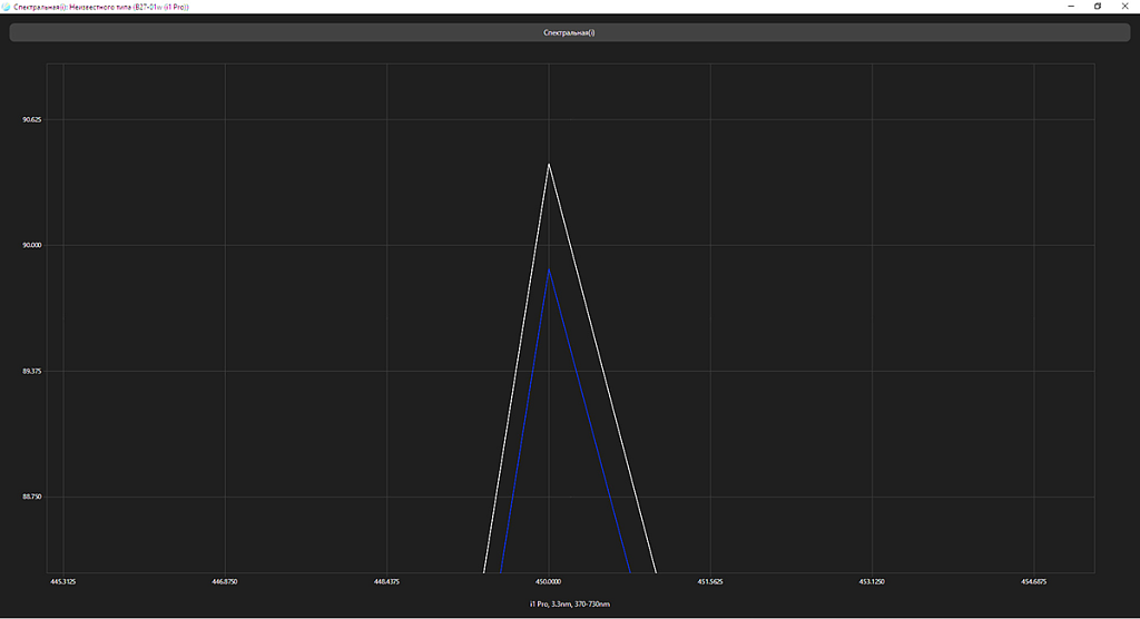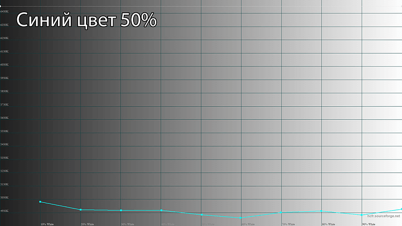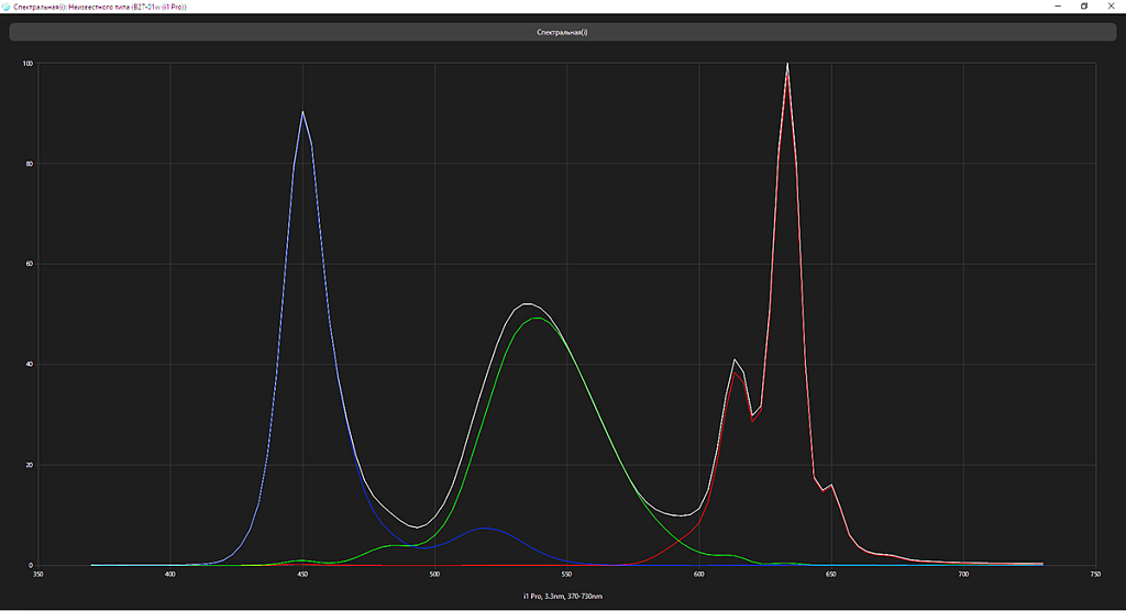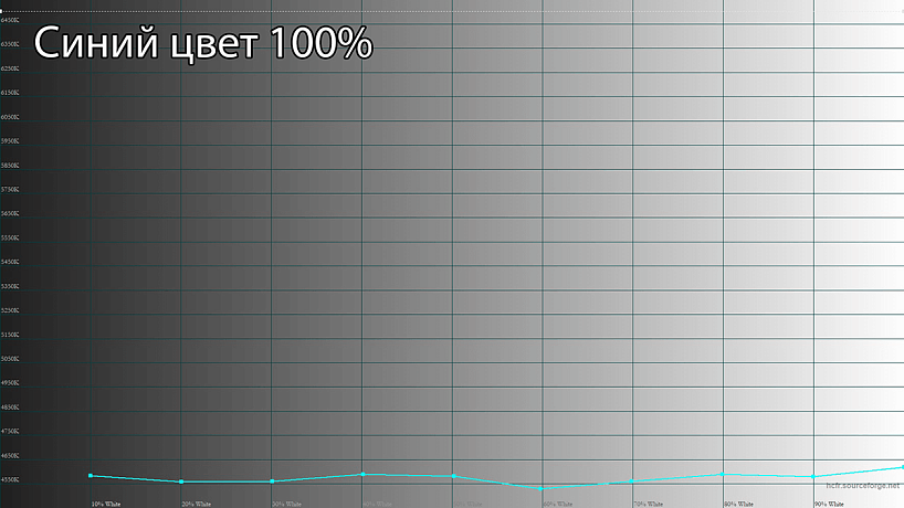 Пик синего цвета оказался на стандартных 450 нм, а компоненты основных цветов в незначительной степени подмешивают друг к другу, что указывает на использование монитором родного цветового охвата матрицы (ну почти) – полный охват DCI-P3 здесь точно никак не получить, что, впрочем, характерно для бюджетного монитора.