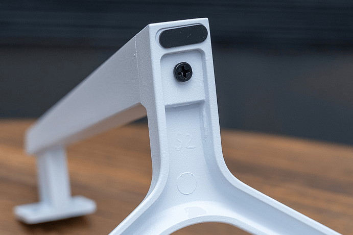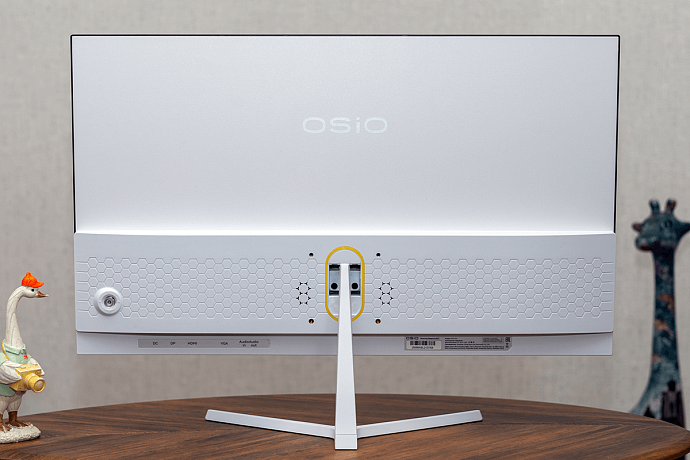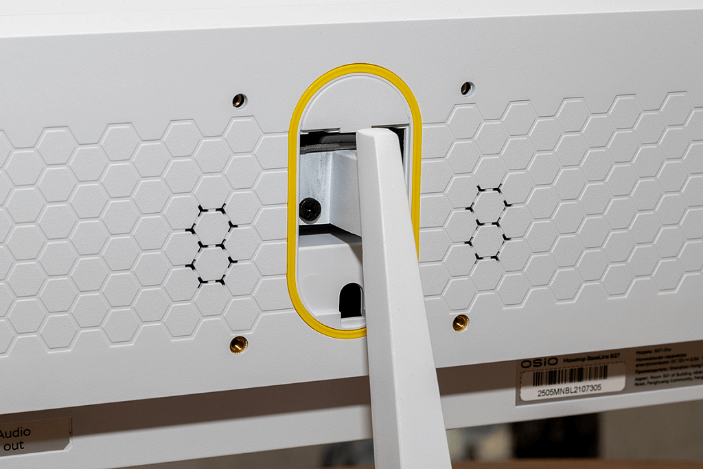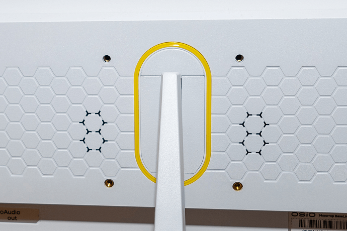 Основной материал корпуса – практичный матовый пластик белого и частично чёрного цветов. Задняя сторона интересна сравнительно крупными рельефными узорами в виде гексагона. Возле крепления для подставки есть интересная на вид овальная жёлтая вставка – это декоративный элемент без подсветки. Чёрными отверстиями возле крепления являются прорези для двух динамиков, а ещё предусмотрено крепление VESA 75 x 75 мм для возможности использования кронштейна.