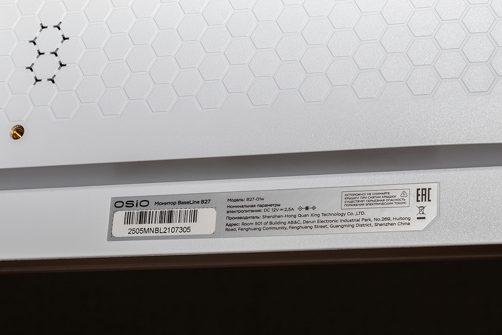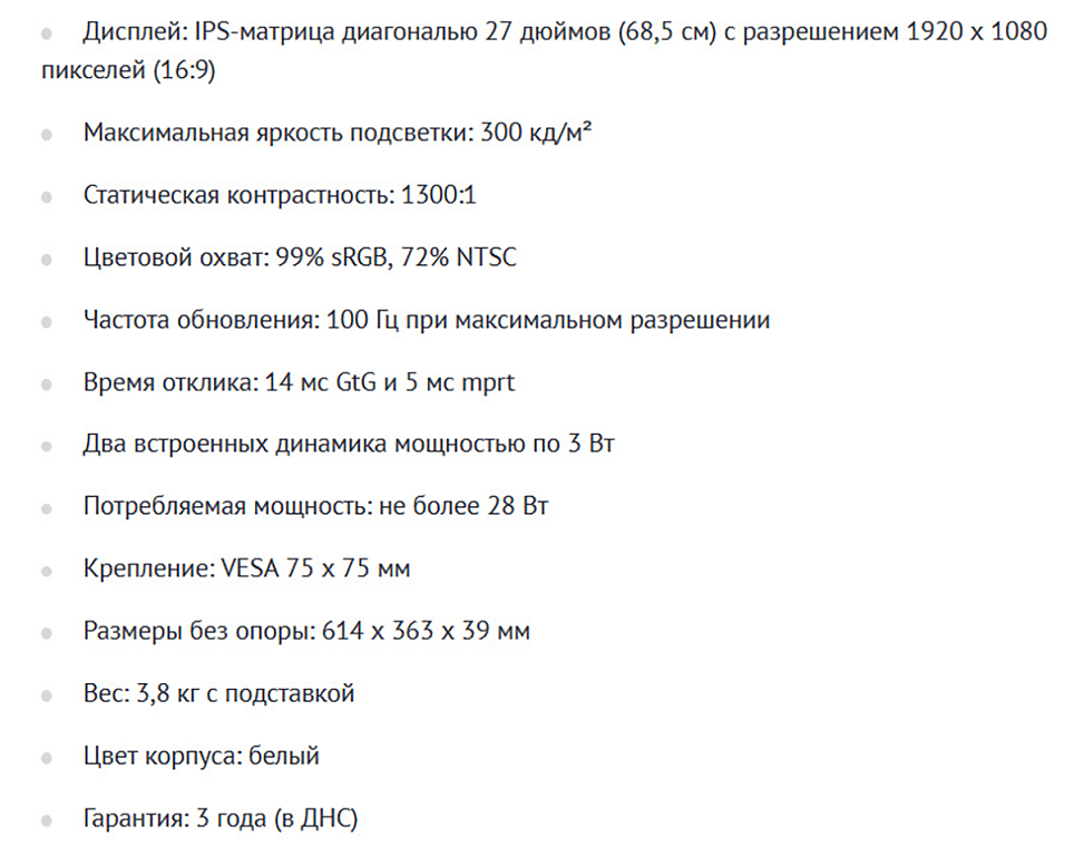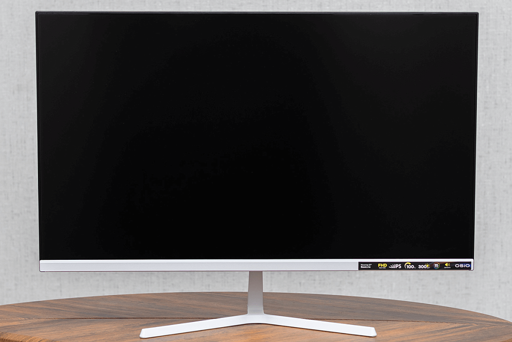 OSIO BaseLine B27-01w несмотря на небольшую стоимость имеет не только приятный дизайн (корпус белого цвета точно смотрится отлично), но и дисплей с качественным для бюджетного устройства изображением, яркостью подсветки более 300 кд/м² и частотой обновления 100 Гц. При своей стоимости герой обзора уже стал одним из самых интересных официально продающихся в России мониторов, к тому в магазине ДНС на него даётся гарантия в 3 года.