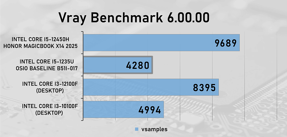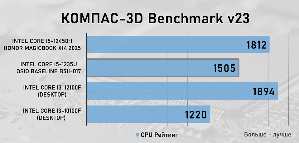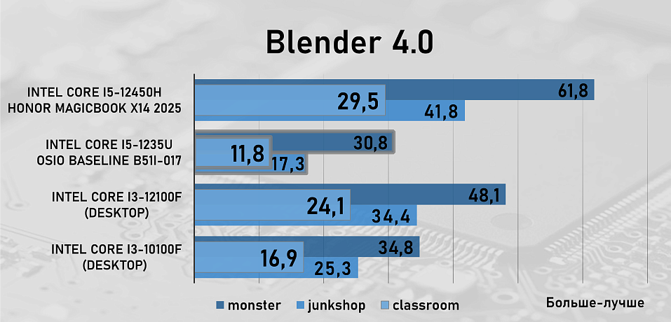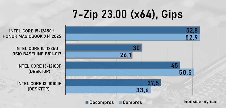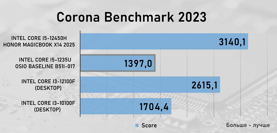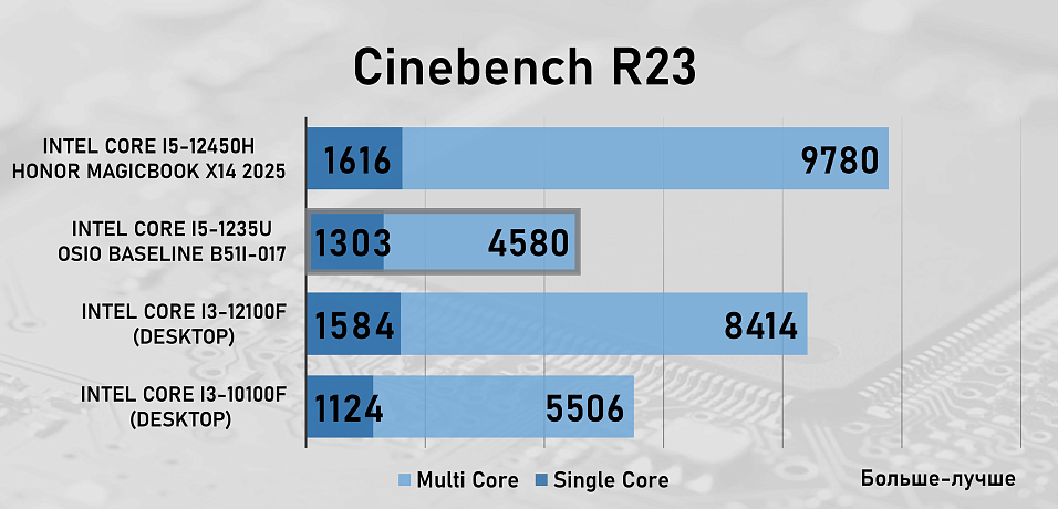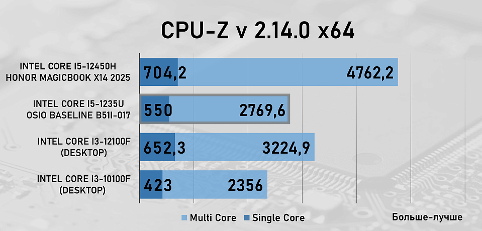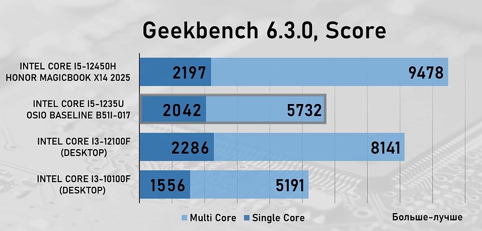 Для сравнения производительности OSiO BaseLine B51i-017 и процессора Intel Core i5-1235U в рабочих задачах мы добавили в тестирование два десктопных процессора — Intel Core i3-10100F c памятью на частоте 3200 МГц и Intel Core i3-12100F с памятью на частоте 5600 МГц, а так же ноутбук Honor MagicBook X14 2025 на базе процессора Intel Core i5-12450 с памятью LPDDR4, которая работала на частоте 4266 МГц .