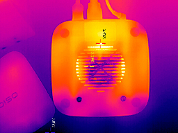 Условно корпус можно разделить на три части: основание, центральная и верхняя. Основание выполнено из черного пластика, в нем со всех сторон есть перфорация, через которые выдувается горячий воздух. Снизу также есть перфорация, через которую и задувается холодный воздух внутрь.