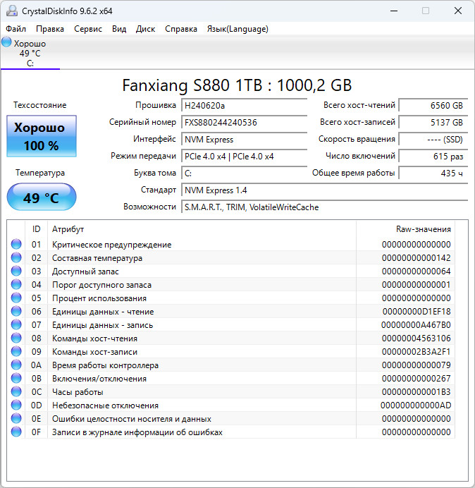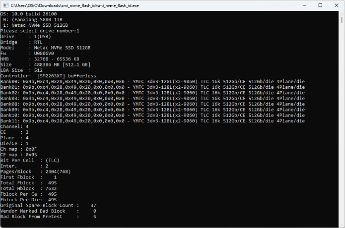OSiO BaseLine B51i-017 оснащается NVMe накопителем объёмом 512 Гб c интерфейсом PCie 3.0, в данном случае он представлен китайской компанией Netac, точная модель Netac S930E. Он основан на бюджетном контроллере Silicon Motion SM2263XT и чипах памяти YMTC 3dv3-128L (x2-9060) TLC 16k 512Gb/CE 512Gb/diе 4Plane/die. Драм буфера нет, но есть поддержка технологии HMB (Host Memory Buffer).