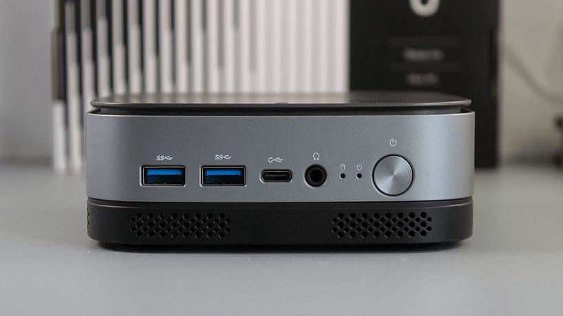 Центральная часть серебристого цвета, в ней размещаются разъёмы и элементы управления устройством. На передней панели корпуса расположено два порта USB 3.2 Gen 1, порт USB Type-C USB 3.2 Gen 2, а также аудио разъём 3,5 мм для подключения наушников и микрофона. Тут также присутствуют кнопка включения и индикаторы активности. Причем что касается индикаторов, они совершенно ненавязчивые, а с учетом того, что данный мини ПК в 90% случаев будет находиться на столе, это является большим плюсом.