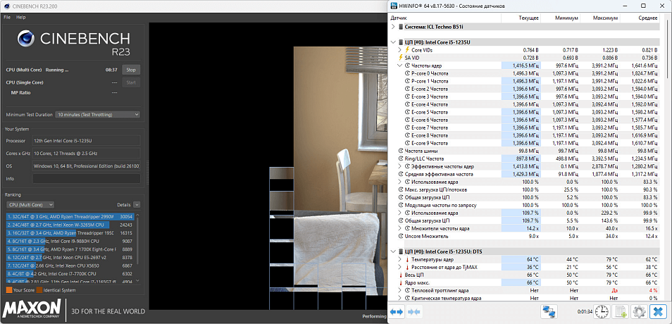 Максимальное энергопотребление для данной модели процессора составляет 20 Вт при кратковременных нагрузках и 15 Вт при продолжительных, таким образом рабочая частота ядер будет довольно сильно зависеть от количества задействованных потоков процессора. В случае с Cinebench R23 это будет примерно 1500 МГц для P-ядер и 1400 МГц для E-ядер.