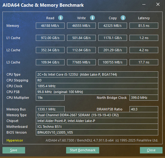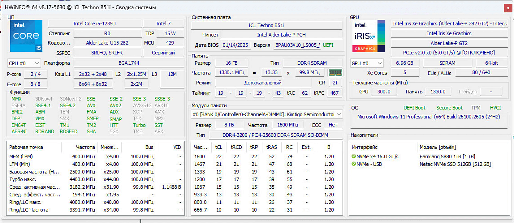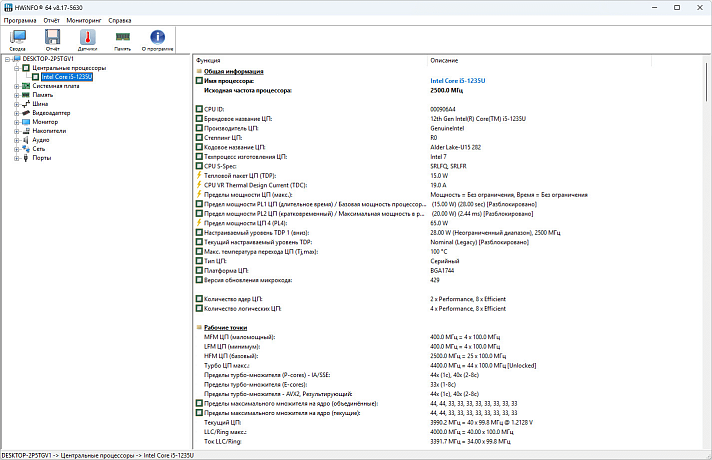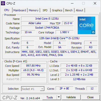 В своем распоряжении процессор Intel Core i5-1235U имеет 2 производительных P-ядра с поддержкой технологии HT и максимальной рабочей частотой в режиме турбо-буст до 4400 МГц при однопоточных нагрузках и 8 энергоэффективных E-ядра с максимальной рабочей частотой 3300 МГц.
