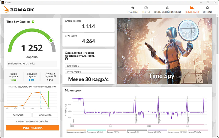 Стрест-тесты ноутбук также успешно проходит, при этом и температура и уровень шума держатся на комфортном для пользователя уровне.