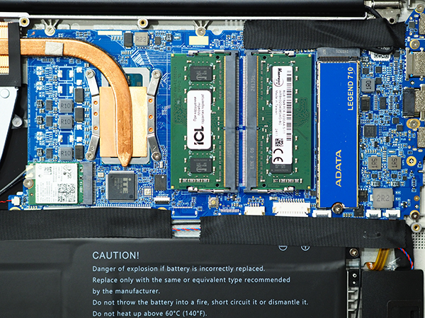 Если убрать нижнюю панель, то можно получить доступ к установленному железу и, при желании, провести небольшую модернизацию. В частности, можно заменить оперативную память и диск (SSD M.2). Вам доступны 2 слота по ОЗУ – в данной комплектации установлено 2 планки DDR4 по 8ГБ каждая, и SSD M.2 ёмкостью 1 ТБ. За столь простую и доступную возможность модернизации стоит сказать отдельное спасибо производителю.