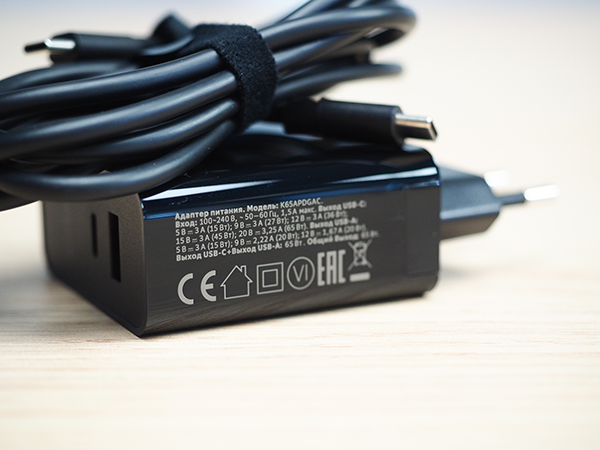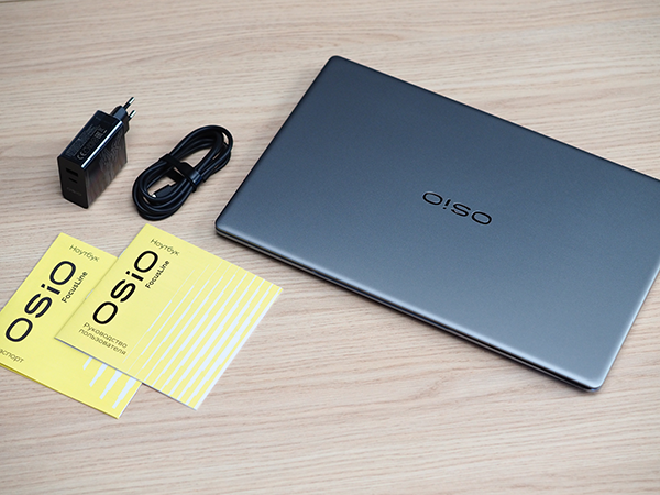 Ноутбук OSiO FocusLine F150i-023 поставляется в комплекте с 65 ваттным блоком питания и кабелем USB Type-C - USB Type-C для зарядки. Кроме того, на зарядном устройстве также расположен дополнительный USB разъем к которому можно подключить кабель для зарядки смартфона. Такой подход позволяет брать с собой в путешествие всего один блок питания – современный и правильный подход.