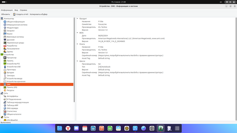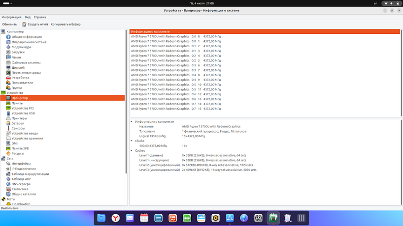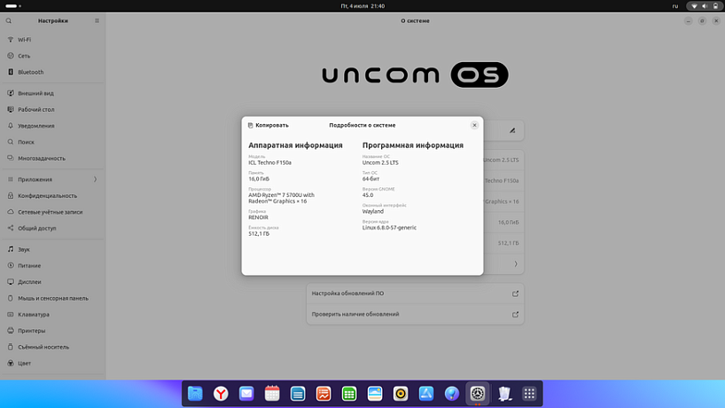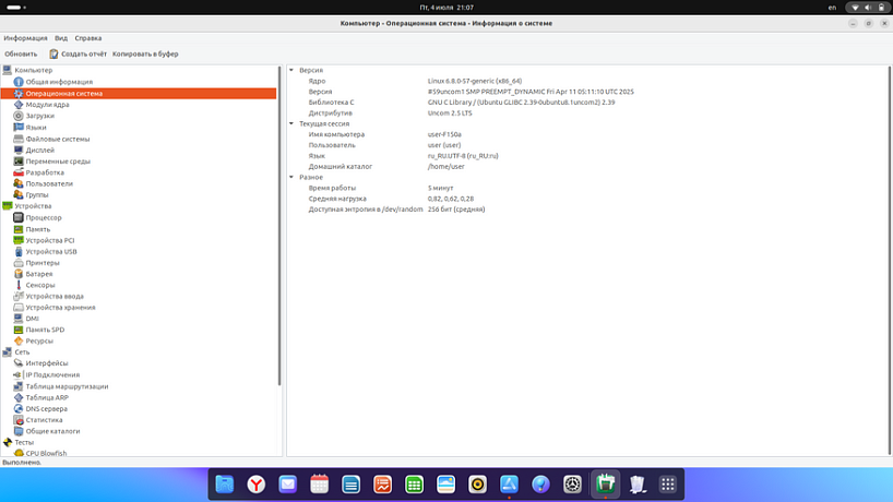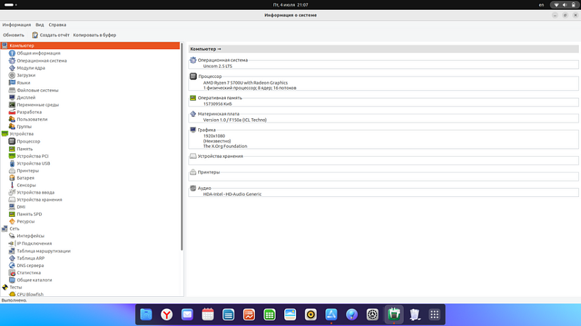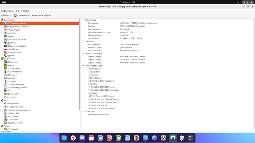 Ниже приведена информация о системе. Вот некоторые из основных параметров: процессор AMD Ryzen 7 5700U, память 16 Гб, операционная система Uncom 2.5 LTS базирующаяся на Linux 6.8.0-57-generic, разрешение экрана 1920х1080 пикселей.