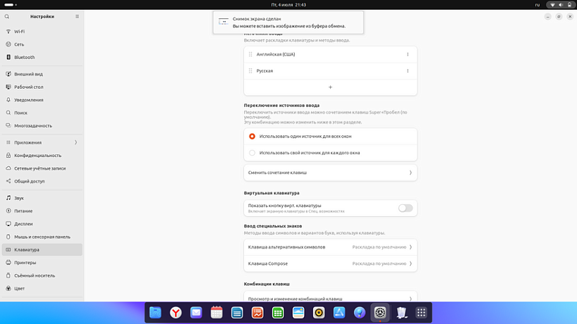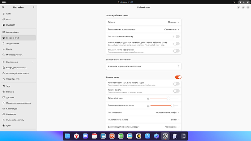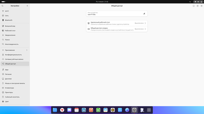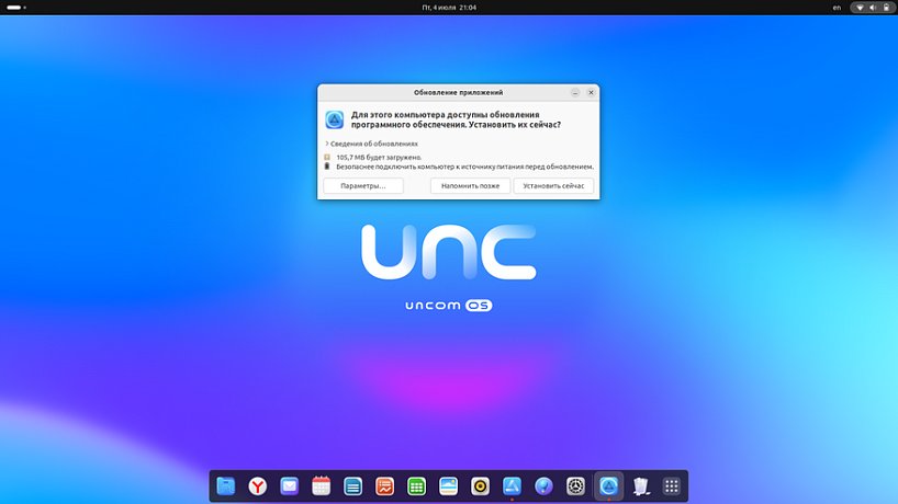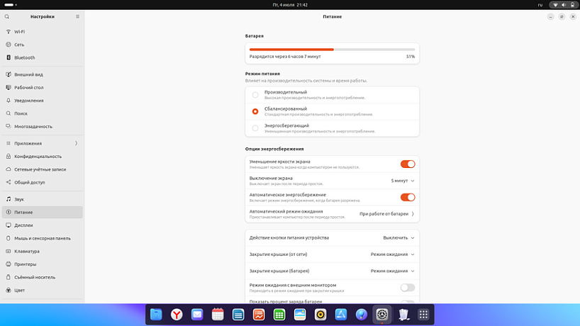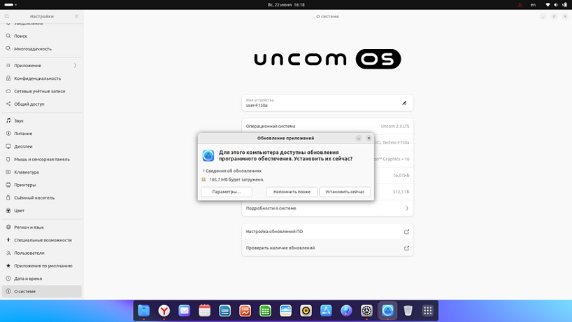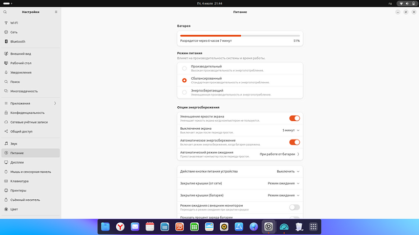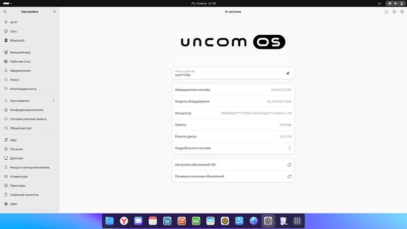 Пришло время поговорить про операционную систему, которая установлена тут по умолчанию. Нет это не Windows как подумали многие, это отечественная разработка под названием Uncom OS. Это операционка с открытым кодом на основе Linux. Но сразу забегу вперед и скажу, что не стоит пугаться, что тут нет привычного всем Windows. Меню настроек чем-то напоминает то, что мы видим в своих смартфонах, структурировано по блокам. В разделе «Рабочий стол» вы можете настроить режим панели, размер значков и прозрачность панели задач. На вкладке «Уведомления» можно настроить приложения, от которых вам будут приходить оповещения, а от каких нет. В «Конфиденциальности» можно настроить пароль и другие параметры. В разделе «Питание» вы можете выбрать один из нескольких режимов энергосбережения или же настроить по-своему, отключив все не нужное и тем самым продлив жизнь аккумулятору без подключения к розетке. На самом деле в меню много интересных пунктов, которые позволяют настроить ноутбук под свои запросы и нужды.