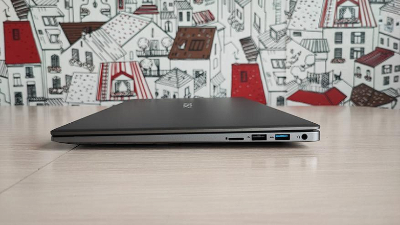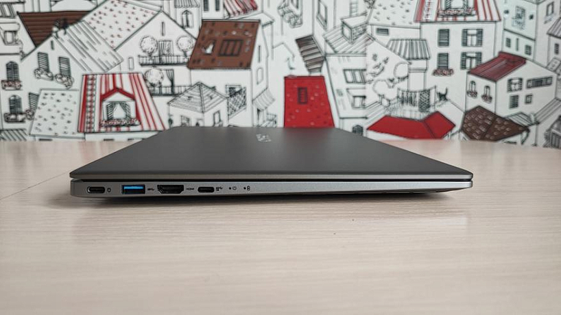 Снизу, на обратной стороне ноута есть динамики рассчитанные на 2 Вт мощности. Такого объема вполне достаточно, чтобы прослушивать аудио в мессенджерах, просматривать видеоролики и фильмы. Звучание достаточно чистое. Мне этого звука вполне хватило в небольшой командировке в Подмосковье. Теперь поговорим про разъемы. Тут их 8 штук: по 4 элемента с каждой стороны. В наличии разъёмы HDMI 2.1, USB Type-C, аудиоразъем 3.5 мм jack, разъемы USB Type A и C типа USB 2.0, USB 3.2 Gen1 x2, разъем для microSD карты. Порт Type-C, который расположен на левом боку предназначен только для зарядки устройства, второй порт 3.2 Gen1 full function (DP+PD+data), через него также можно заряжать или например, подключить док-станцию одним кабелем для данных, монитора и зарядки. Так же тут 2 порта Type A 3.2 Gen1, а один 2.0. Скажу так, что мне вполне хватило этого количества разъемов.