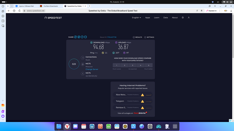 Скорость интернета в сети 2.4G на скачивание 94 Mbps, а закачивание 36 Mbps. В сети 5G скорость уже выше и составляет 449 Mbps на скачивание и 433 Mbps на загрузку, что представлено на скринах ниже. Максимальная скорость канала 500 Mbps.
