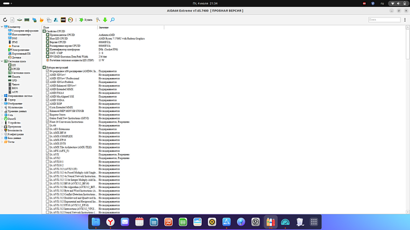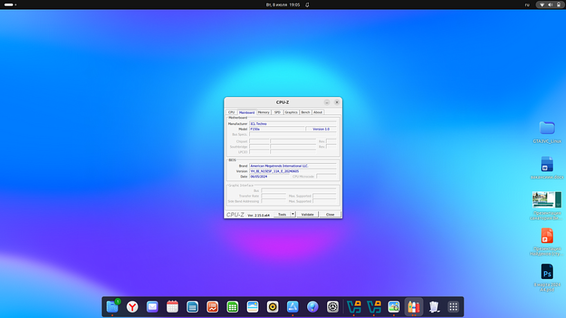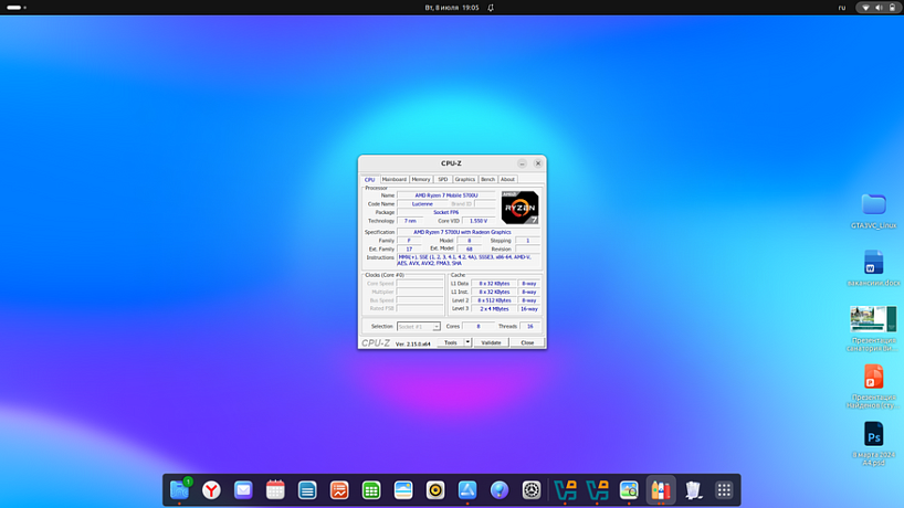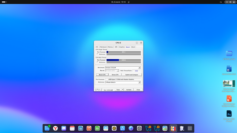 Далее воспользовался утилитой CPU-Z и посмотрел характеристики ноута, они представлены на скрине ниже и прогнал тесты, которые тоже на скринах ниже. Запустил, кстати, эти тесты через приложение Bottles. В результате получил 491 баллов CPU Single Thread и 3250 CPU Multi Thread.