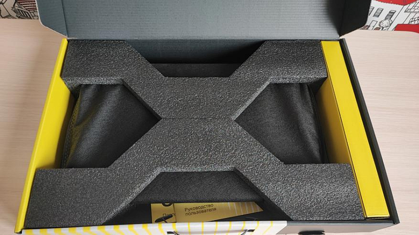 Ноутбук поставляется в коробке из плотного картона в фирменных цветах бренда. Открыв ее, вы увидите, что ноутбук лежит в тряпичном пакете, а сверху укреплен поролоновыми вставками в виде буквы Х.