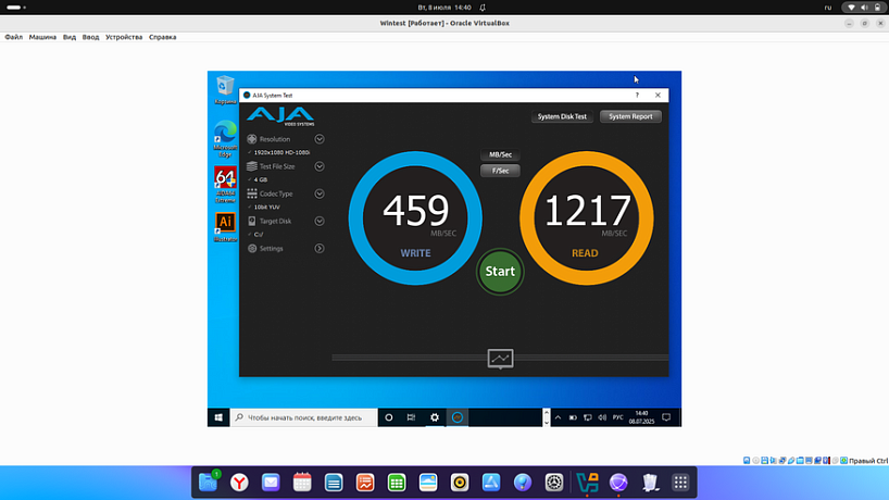 Тесты на Windows установленный через эмулятор. Скорость записи 459 Мб/сек, а чтения 1217 Мб/сек.