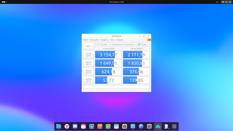 Скорость записи и чтения на SSD диске проверил программой KDiskMark. Результаты хорошие и они на скрине ниже. Если говорить в среднем то скорость чтения 3000 Мб/сек, а записи 2100 Мб/сек.