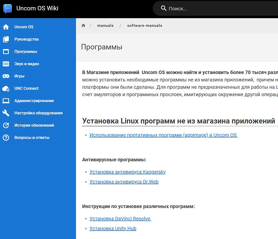 Решил вынести это в отдельный блок. Если по операционной системе возникнут вопросы, то проще всего отправиться на официальный сайт ОС. Во-первых, там есть полное руководство в формате «Вики». А ещё есть чат с техподдержкой в ТГ. Туда можно задать любой вопрос. Ну и помните, что UNCOM OS имеет много общего с UBUNTU, поэтому многие решения оттуда работают и тут.