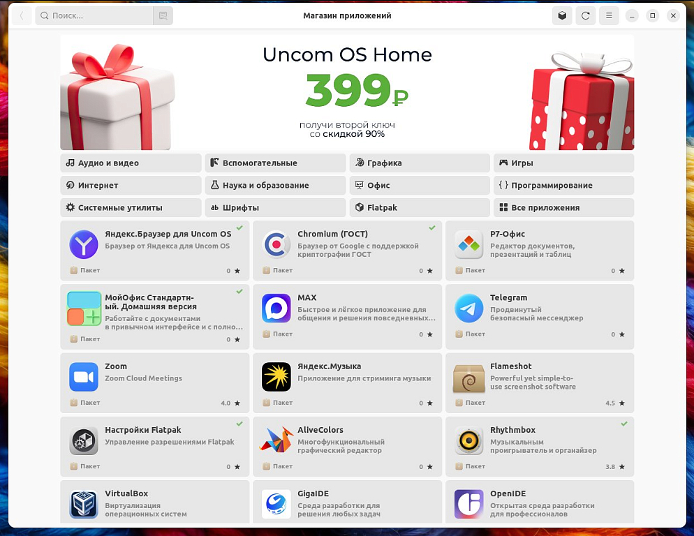 За остальными приложениями можно отправляться в Интернет, но лучше сначала открыть встроенный магазин приложений. В нем есть все — от Zoom и Telegram (мессенджер MAX тоже есть!) до альтернативных браузеров, «Яндекс Музыки» и игр. Также имеется поддержка специализированных программ: Blender, Cura, FreeCAD. А ещё в магазине есть эмулятор для Windows-программ.