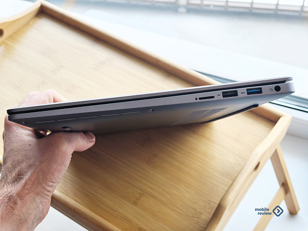 - Ноутбук тонкий, но при этом тут полный набор портов. С правой стороны — microSD и два USB-порта.